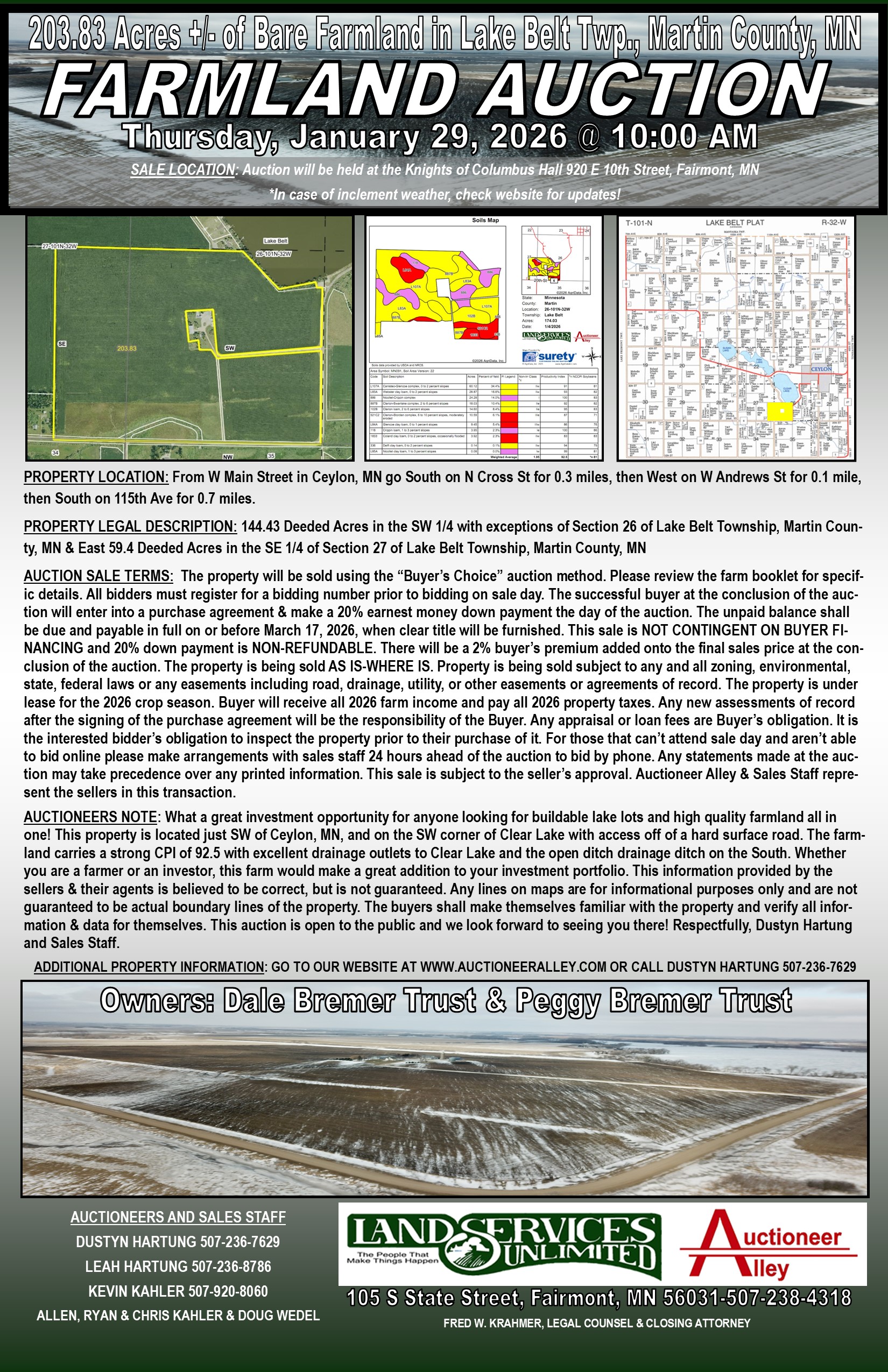 204.90 Acres +/- in Sections 26 & 27 of Lake Belt Township, Martin County, MN. Sale Owners: Dale & Peggy Bremer Trusts Sale Date: Thursday, January 29, 2026 @ 10 AM Sale Location: Knights of Columbus Hall 920 E 10th Street, Fairmont, MN